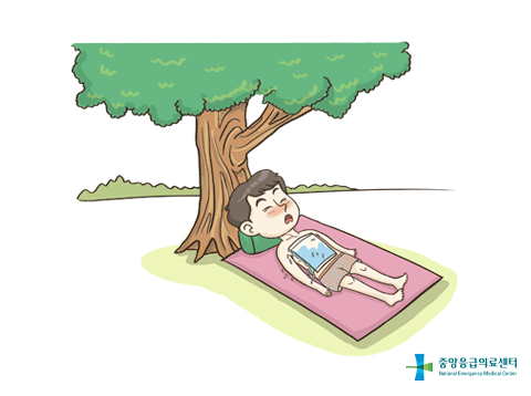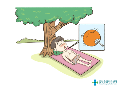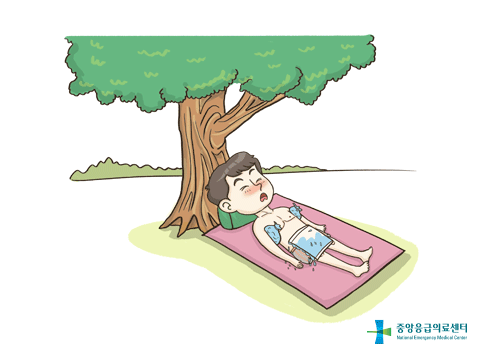 그늘이나 시원한 장소로 이동하여 옷을 벗긴 후 119에 신고한다.