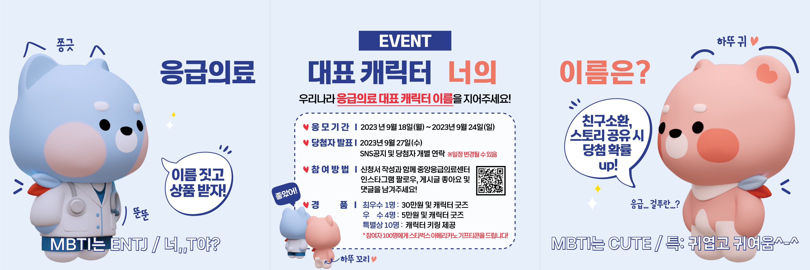 응급의료 대표 캐릭터가 개발되어, 대표 캐릭터 이름 짓기 공모 이벤트를 진행하고 있습니다.